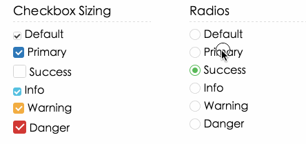 <input type="radio" name="radio3" class="mgr mgr-sm" /> Default <input type="radio" name="radio3" class="mgr mgr-primary" /> Primary <input type="radio" name="radio3" class="mgr mgr-success mgr-lg" checked="checked" /> Success <input type="radio" name="radio3" class="mgr mgr-info mgr-sm" /> Info <input type="radio" name="radio3" class="mgr mgr-warning" /> Warning <input type="radio" name="radio3" class="mgr mgr-danger mgr-lg" /> Danger不同尺寸class