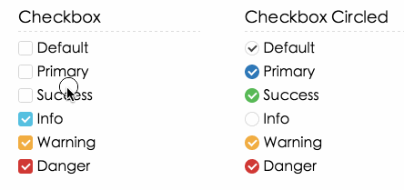 <input type="checkbox" class="mgc" checked="checked" /> Default <input type="checkbox" class="mgc mgc-primary" checked="checked" /> Primary <input type="checkbox" class="mgc mgc-success" /> Success <input type="checkbox" class="mgc mgc-info" checked="checked" /> Info <input type="checkbox" class="mgc mgc-warning" checked="checked" /> Warning <input type="checkbox" class="mgc mgc-danger" checked="checked" /> Danger单选框